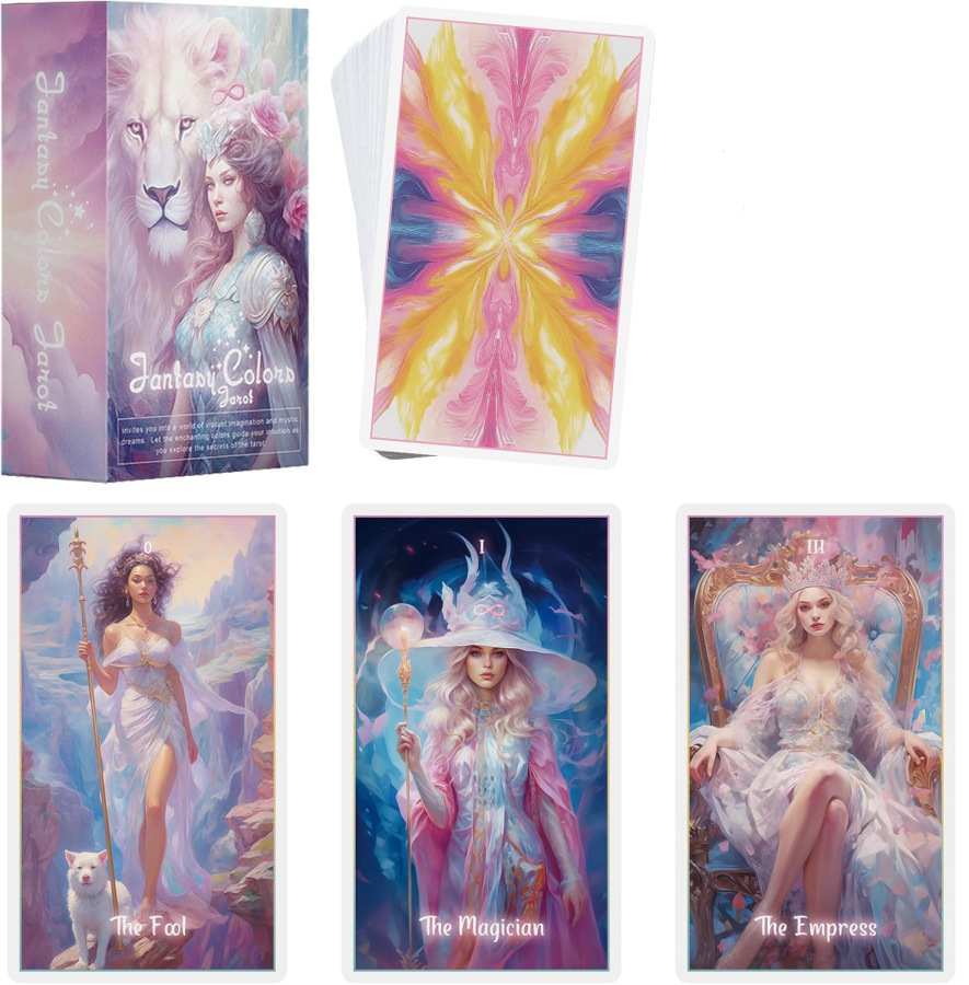 Tento balíček exceluje v kombinovaní estetických prvkov so silným emocionálnym a psychologickým významom, ponúkajúc hlboké pohľady na osobné výzvy a témy sebareflexie. "Fantasy Colors Tarot" je ideálny pre tých, ktorí hľadajú vizuálne pôsobivý a duchovne obohacujúci zážitok.