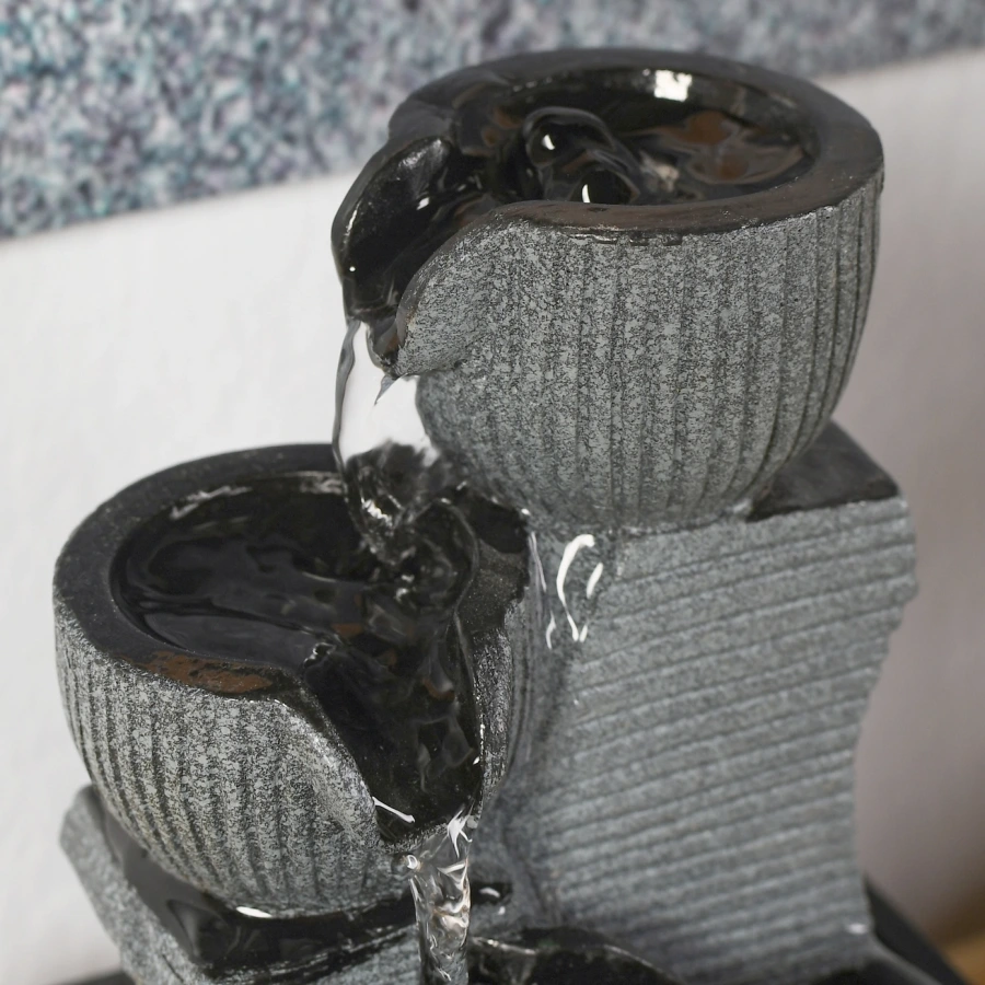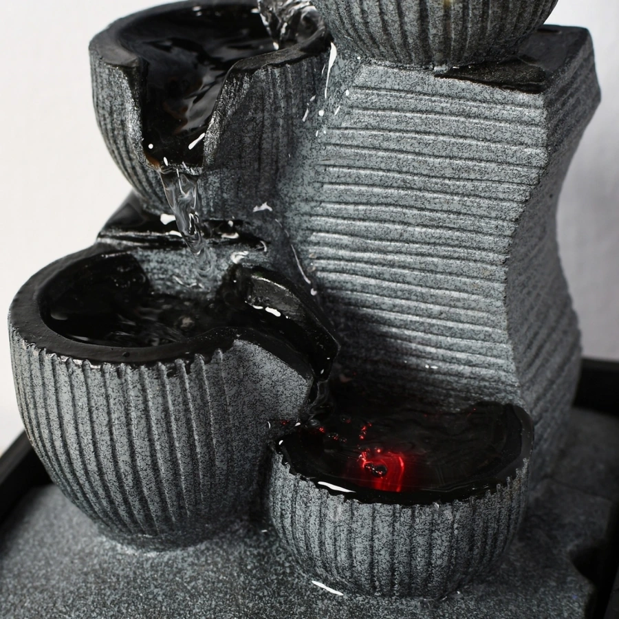 Predsavujeme fontánu Kini, dokonalý vodný prvek, ktorý prináša harmóniu a pokoj do akéhokoľvek interiéru. S elegantným a kompaktným dizajnom je fontána Kini ideálna pre malé priestory a ponúka štyri úrovne vody, osvetlené útulnými farebnými LED diódami, ktoré vytvárajú modernú a duchovnú atmosféru, ideálnu pre ezo a feng shui.