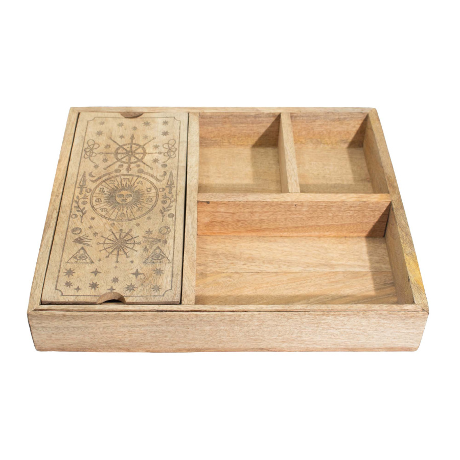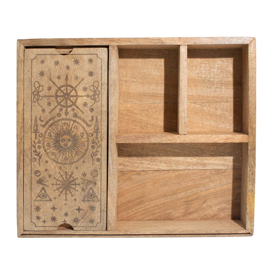 Je vyrobená z prírodného mangového dreva a má starostlivo naplánované vnútorné usporiadanie s viacerými priehradkami na oddelenie tarotových balíčkov, kryštálov, kyvadiel, vykurovacích zväzkov a malých rituálnych predmetov.