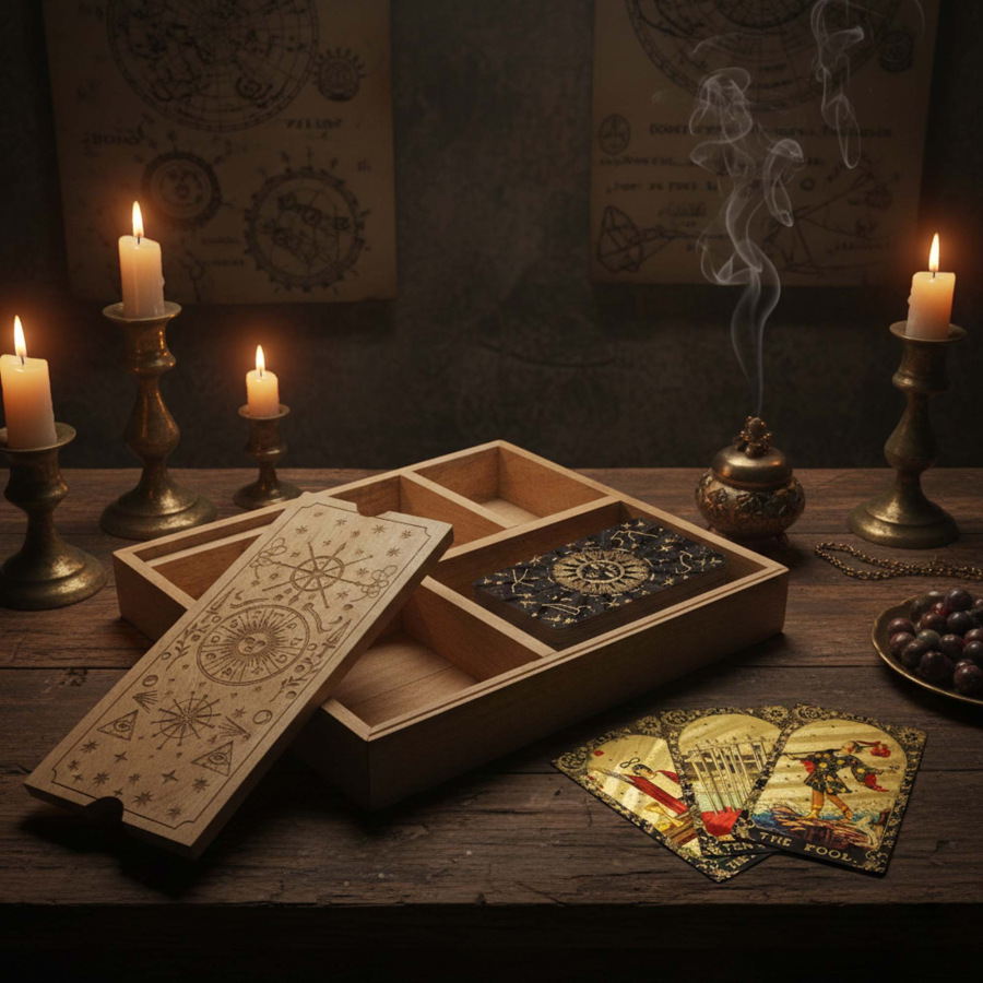 Štvordielna tarotová krabička pre vykladačov, ktorí pracujú s kompletnou sadou nástrojov.