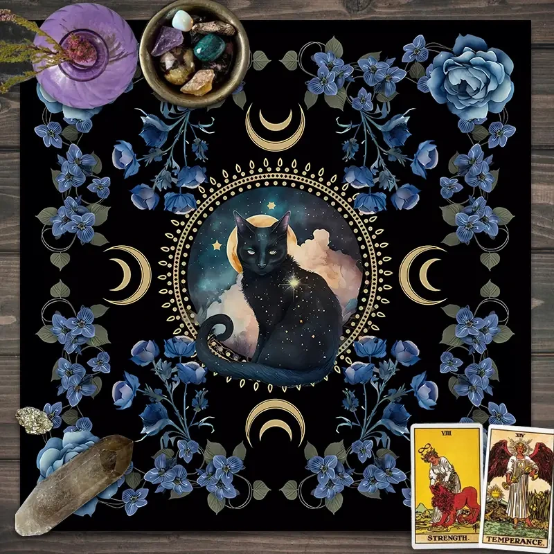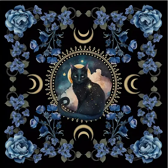 Vytvorte tajomnú atmosféru počas vašich veštieb, tarotových rituálov či duchovného rozvoja s týmto jedinečným obrusom na veštenie. Magický obrus je zdobený nádherným motívom čiernej mačky s korením mystiky, obklopený kvetmi modrých ruží a s mesiacmi symbolizujúcimi dych a energiu noci.