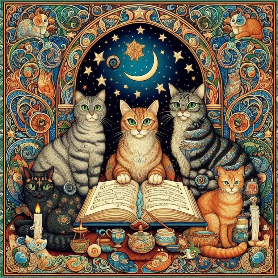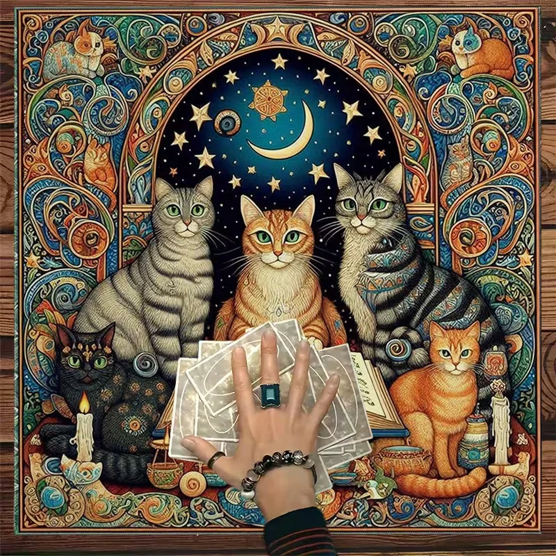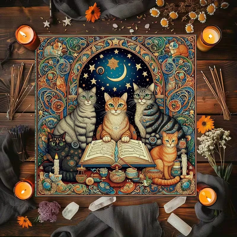 Tento očarujúci obrus na veštenie vás prenesie do sveta plného mystiky a mágie. Stredobodom sú krásne mačky, každá s unikátnym výrazom, sústredené okolo starodávnej knihy otvorenej pre nové odhalenia. Nad nimi sa rozprestiera nočná obloha so žiarivými hviezdami a mesiacom, ktoré do priestoru vnášajú tajomnú atmosféru. Detaily a bohaté farby robia z tohto obrusu nielen estetický poklad, ale aj mocný nástroj pre každú veštbu. Premeňte svoje rituály na magické zážitky, nechajte sa uniesť a objavte nové tajomstvá osudu.