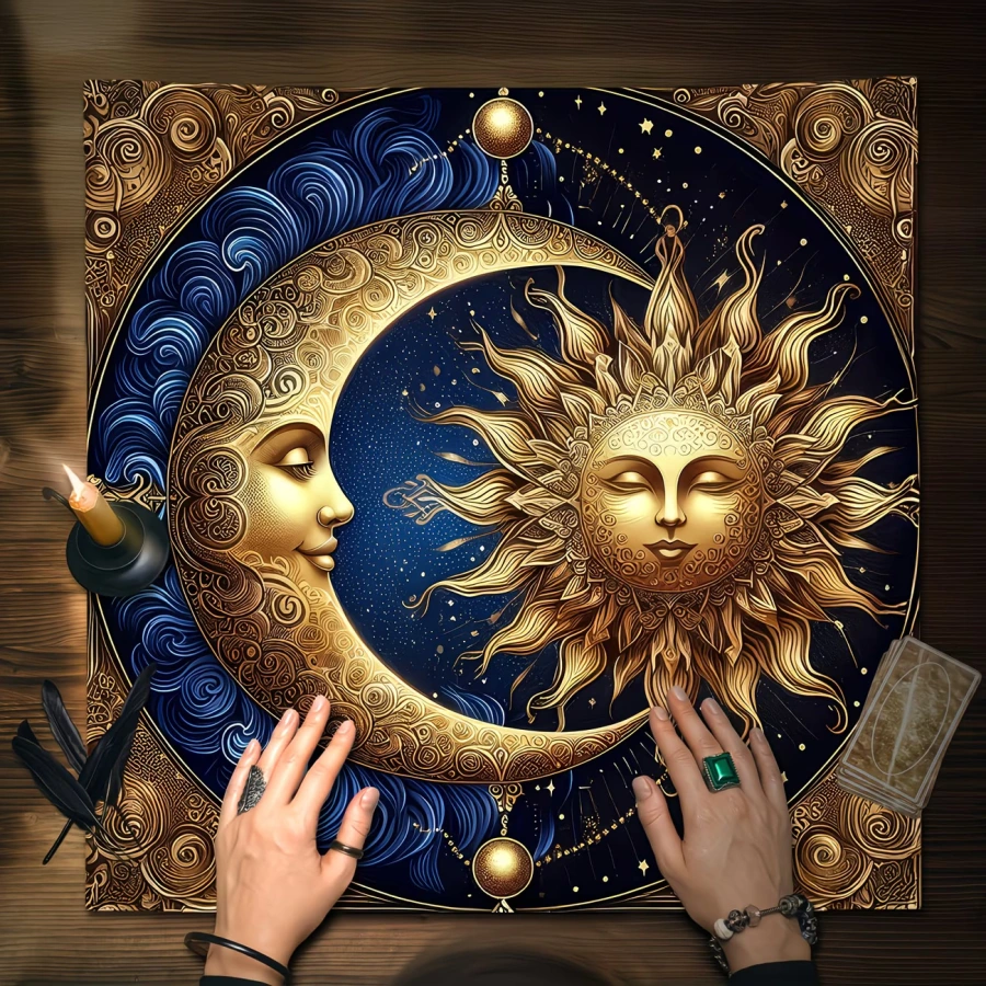 Motív Slnka a Mesiaca zobrazuje dualitu, vyváženosť medzi svetlom a temnotou, čo je ideálny symbol pre tarotové rituály a veštenie. Pôsobivé vyobrazenie a detailné ornamenty vytvárajú úžasnú atmosféru, ktorá podnecuje introspekciu a hlboké duchovné prežívanie.