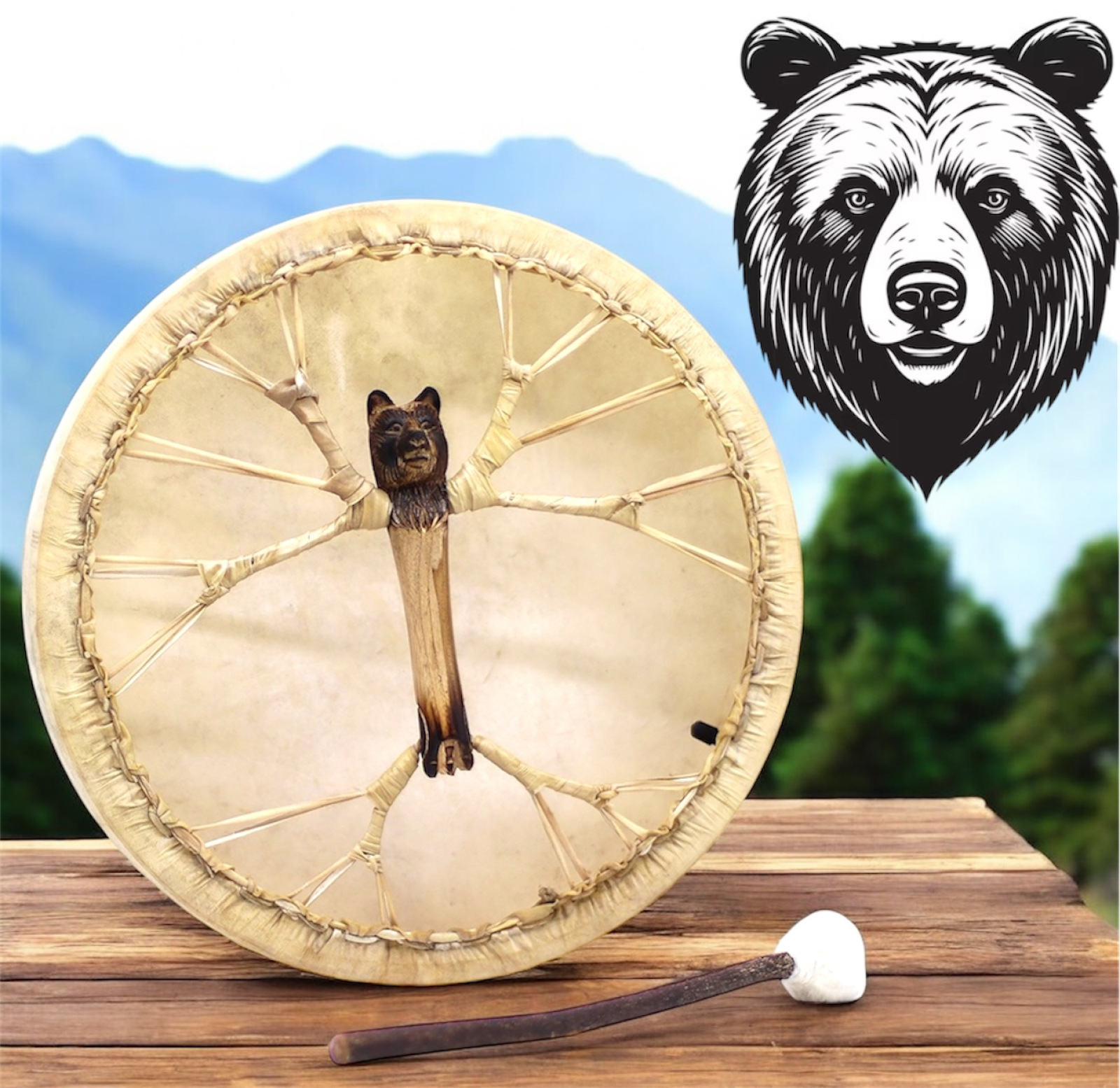 To, čo tento bubon odlišuje, je detailne ručne vyrezávaná rukoväť v tvare medvedej hlavy na zadnej strane. Medveď symbolizuje silu, odvahu a odolnosť, vďaka čomu je bubon nielen mocným duchovným nástrojom, ale aj výrazným dekoratívnym kúskom. Precízna rezba povyšuje bubon zo samotného nástroja na prémiový stredobod pozornosti, ktorý si zákazníci môžu vážiť, vystaviť a hrať naň.