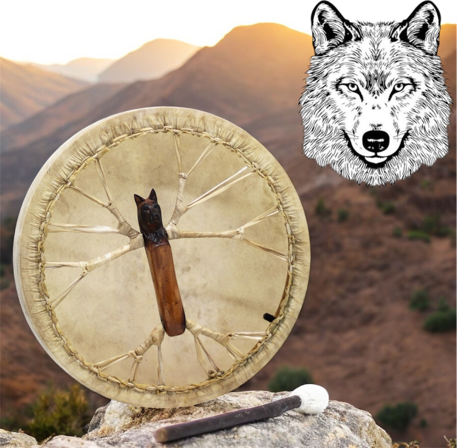 Na zadnej strane sa nachádza ručne vyrezávaná rukoväť v tvare vlčej hlavy – symbol intuície a ochrany, ktorá tento nástroj okamžite odlišuje. Bubon je vybavený nastaviteľným rámom s ručnou pumpou a polstrovaným paličkom, vďaka čomu vytvára hlboké, rezonujúce tóny ideálne na meditáciu, rituály či zvukovú terapiu.