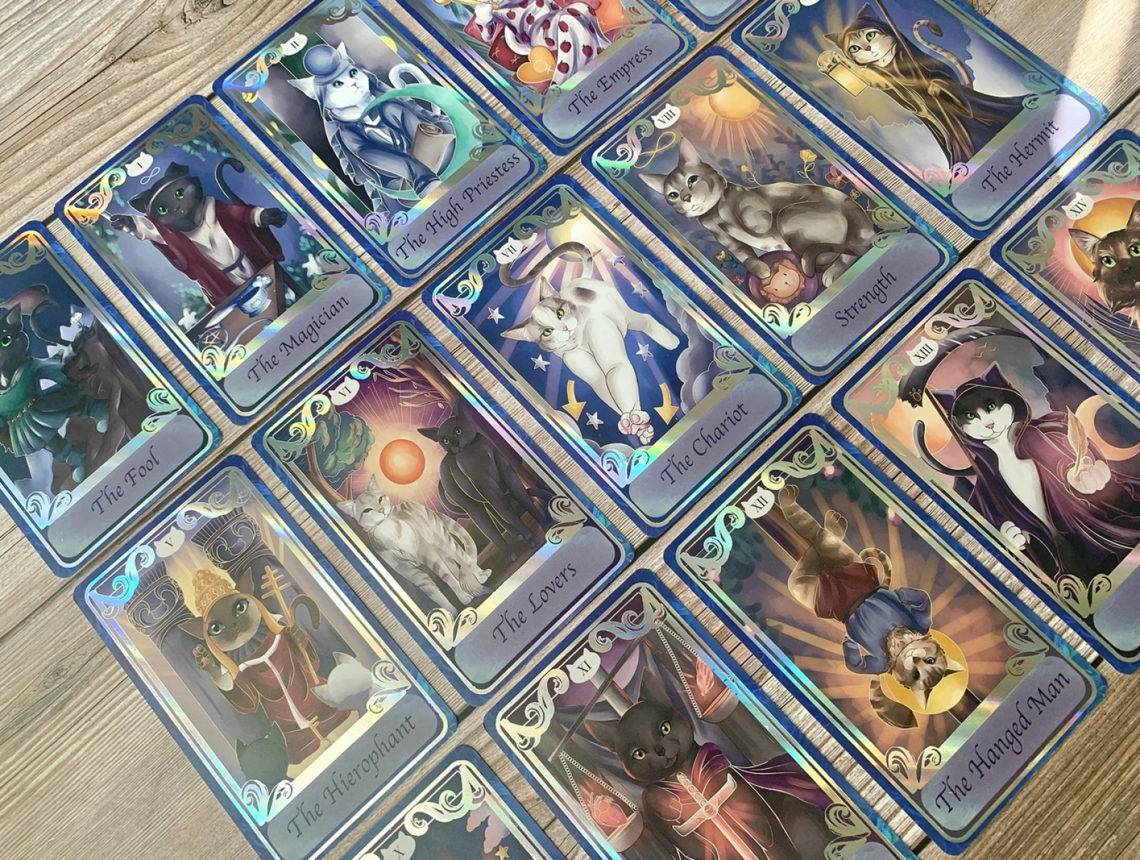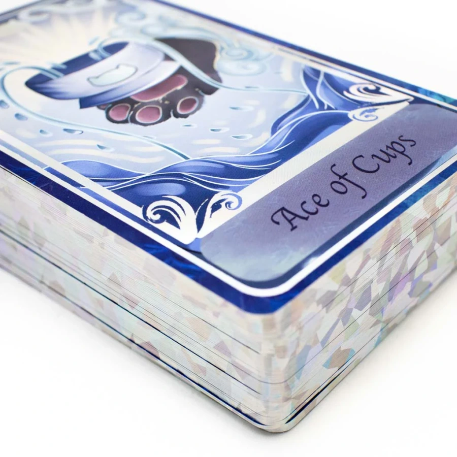 Kombinácia tradičných tarotových symbolov a hravých mačacích motívov, doplnená holografickým leskom, prináša do výkladov nový rozmer.