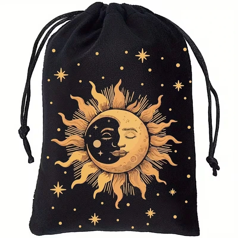 Elegantné vrecko na tarotové karty, ktoré je dokonalým spojením funkčnosti a estetiky. Ponúka spoľahlivú ochranu pred poškodením a opotrebovaním. Jeho jedinečný dizajn s motivom slnka a mesiaca prináša dávku mystiky a harmónie. Praktické zatváranie zabezpečuje jednoduchý prístup k vašim kartám, pričom ich uchová v bezpečí. Vhodné pre všetkých, ktorí si chcú uchovať svoje tarotové karty v štýlovom a bezpečnom obale.