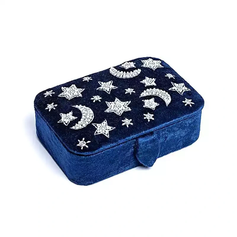 Zamatová krabička s výšivkou Mesiaca a hviezd a ozdobnými korálikmi. Ideálna na šperky, tarotové karty, kamienky či talizmany; praktické zapínanie na remienok.